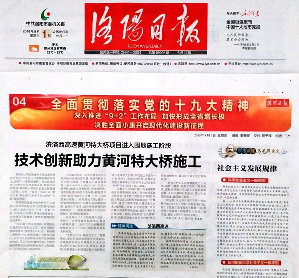 8月1日,《洛阳日报》04版刊发文章《技术创新助力黄河特大桥施工》,对公司黄河特大桥项目技术创新进行了报道。