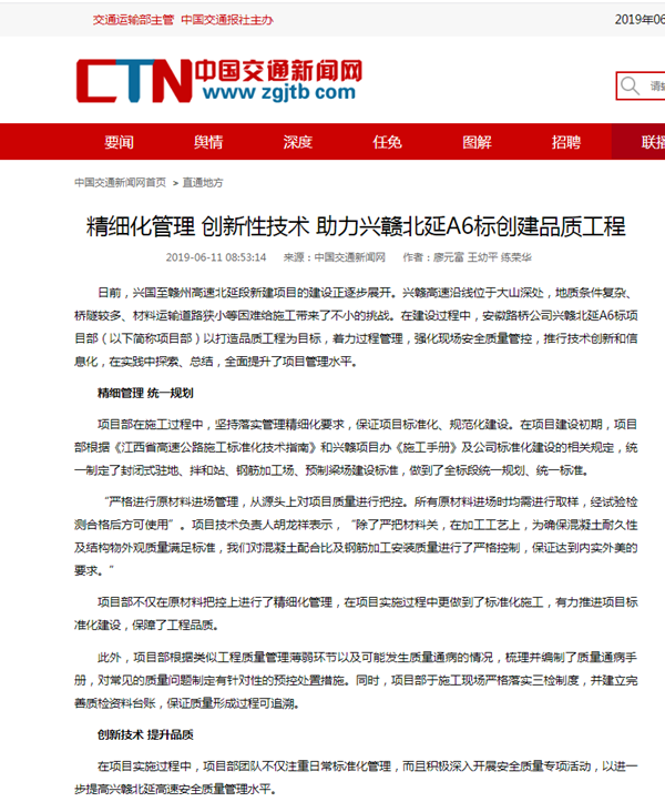 近日,中国交通新闻网以《精细化管理 创新性技术 助力兴赣北延A6标创建品质工程》为题,对公司承建的江西兴赣北延A6标项目建设进行了专题报道。