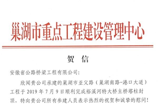 近日,巢湖市重点工程建设管理中心向公司发来贺信,对公司承建的巢湖市亚父路(巢湖南路-港口大道)工程在7月9日顺利完成裕溪河特大桥主桥塔柱封顶表示热烈祝贺和诚挚慰问。