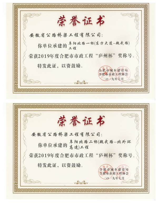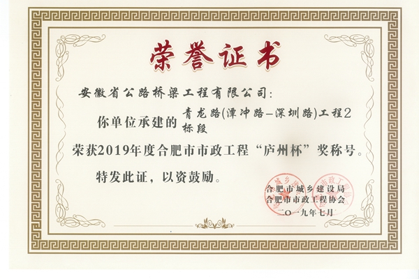 市政分公司三项目喜获“庐州杯” 发布时间:2019年07月29日 来源:市政分公司 发布人: 作者:王东 浏览:3720次 近日从合肥市政工程协会获悉,公司承建的阜阳北路一标、阜阳北路二标、青龙路二标等项目喜获“庐州杯”。截至目前,市政分公司已累计获得19个“庐州杯”奖项。