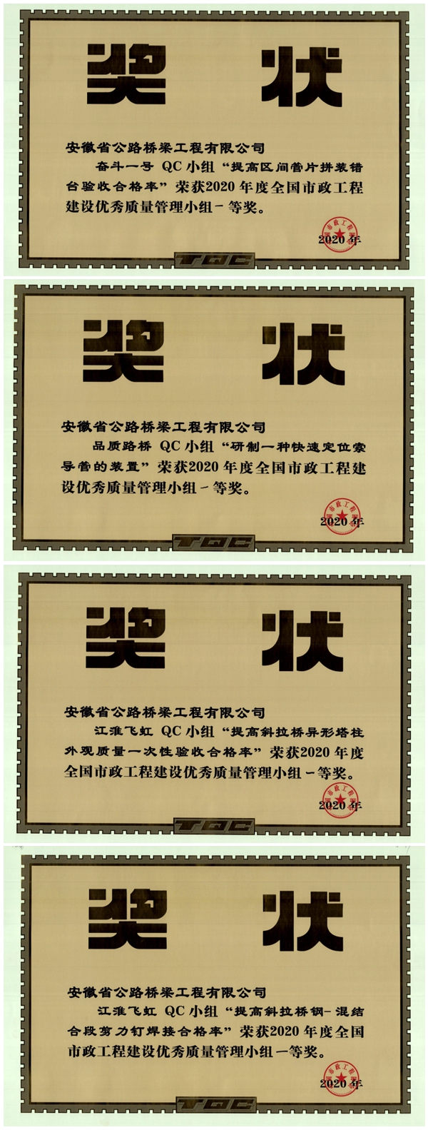 此次全国市政工程建设优秀QC小组活动成果发布会,共有来自25个省、市、自治区的近770支队伍参加。通过两天的激烈角逐,市政分公司申报的《提高区间管片拼装错台验收合格率》《研制一种快速定位索导管的装置》《提高特大斜拉桥异型高塔柱外观质量一次性验收合格率》《提高斜拉桥钢-混结合段剪力钉焊接合格率》四项QC成果全部获得一等奖。
