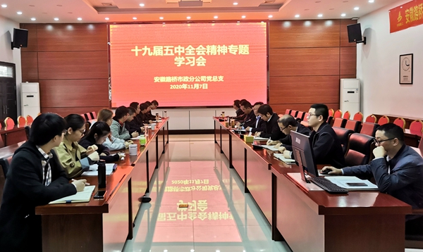 11月7日上午,市政分公司党总支召开专题学习会议,学习贯彻党的十九届五中全会精神,分公司领导班子成员、后勤支部党员、各职能部门工作人员参加学习,分公司党总支书记刘振岭主持会议。