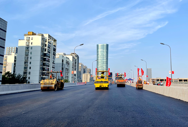 畅通二环(西南环)金寨路、合作化路节点工程主线高架桥桥面首次沥青摊铺顺利完成