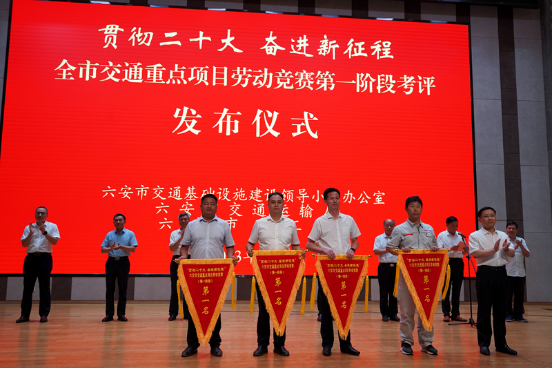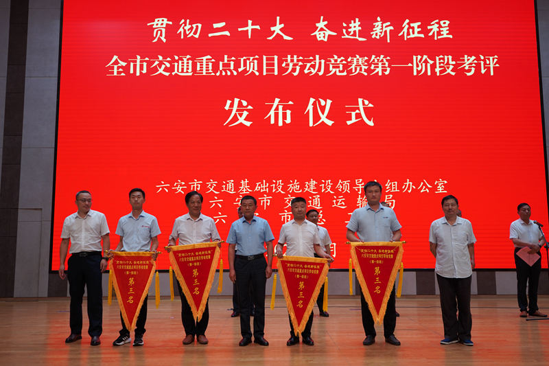 7月15日,在六安市交通运输基础设施领导小组办公室、市交通运输局、市总工会联合举行的“贯彻二十大 奋进新征程”全市交通重点项目劳动竞赛第一阶段考评发布仪式上,公司承建的六安G237一期项目荣获国省干线公路项目第一名、霍邱县彭塔至潘集段建设工程荣获第三名。
