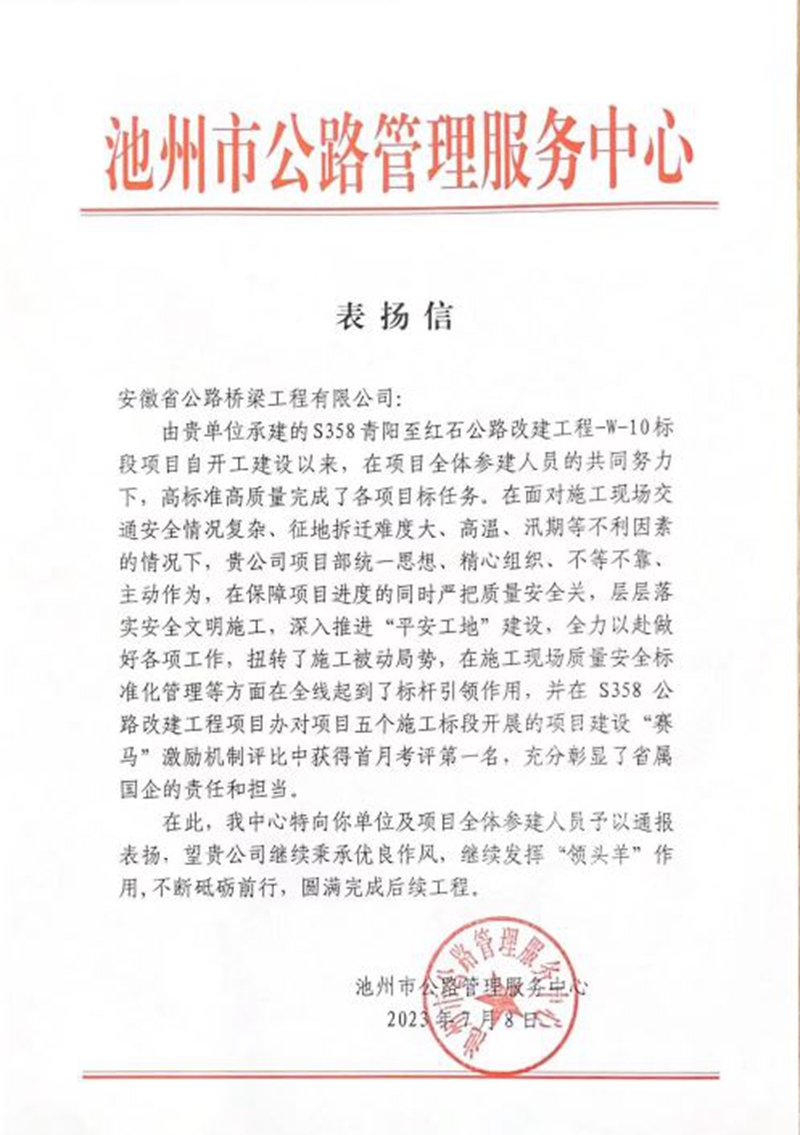 来信指出,公司承建的S358青阳至红石公路改建工程W10标项目开工建设以来,面对现场交通安全情况复杂、征迁难度大、高温、汛期等不利因素,不等不靠、主动作为,在保障进度的同时,推进“平安工地”建设,迅速扭转被动局势,在质量安全标准化管理等方面全线起到标杆引领作用,荣获S358公路改建工程项目建设“赛马”激励机制首月考评第一名,彰显了省属国有企业的责任与担当。