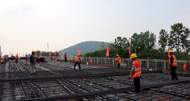 小蜀山东路上跨桥是项目控制性施工节点。施工现场车流量大、重型货车多且新建道路与既有道路存在较大高差导致交通组织极其困难,小蜀山东路南侧房屋未拆迁,现场几乎无施工作业面。面对重重困难,为保障此节点顺利完成,项目部提前谋划,多次组织相关单位召开方案研讨会,优化施工方案,并通过科学组织施工,前后组织十余次交通导改,巧妙利用南幅新建桥梁作为施工便道和作业面,历时45天顺利实现全线首座上跨桥双幅贯通。