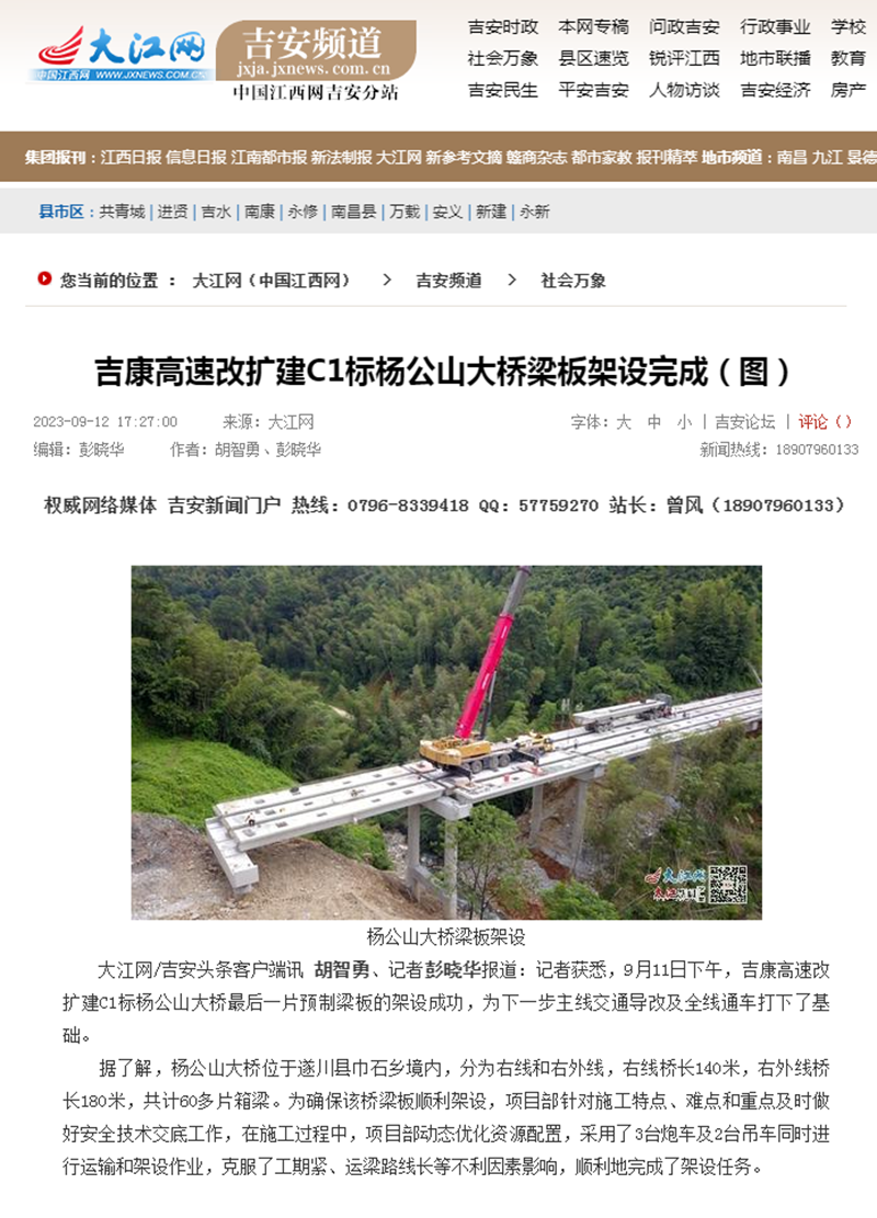 9月11日下午,吉康高速改扩建C1标杨公山大桥最后一片预制梁板的架设成功,为下一步主线交通导改及全线通车打下了基础。