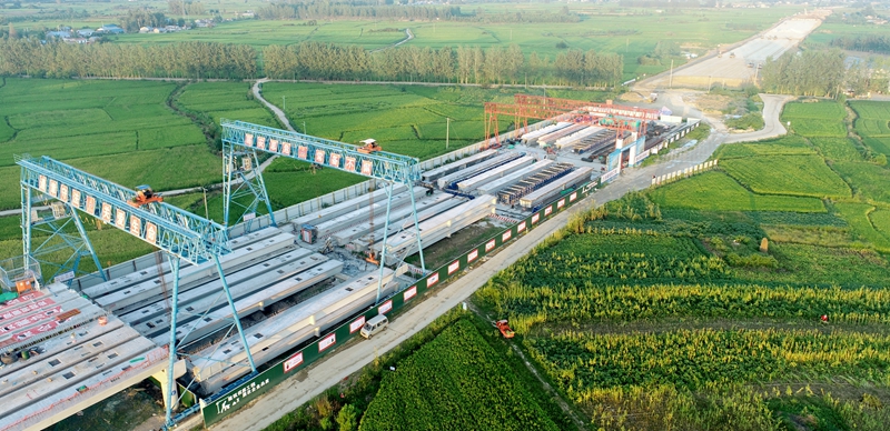 作为项目建设的“重头戏”,三个预制梁场建设与1000余片箱梁的预制和架设是保障项目工期的重要环节。受到土地政策和路基施工工期因素影响,项目西岸梁场原场地建设方案受到很大制约。为此,项目负责人带领技术人员顶着酷暑,找场地、拿方案,将原定于路基段建设的两个梁场改为桥梁区建设,并及时安排人员跟踪土地丈量及临时用地相关事宜。在梁场建设过程中,努力克服场地施工交替频繁、高温雨水、道路运输条件较差等多项难题,在6月实现首片箱梁浇筑;7月西岸预制梁场建设基本完成;8月首跨箱梁架设完成;9月3个梁场均达到满产。劳动竞赛冲锋号吹响以来,项目牢固树立“一切围绕项目转、一切聚焦项目干”的工作理念,确保日日有重点、周周有变化、月月有成效。目前桩基、墩柱、箱梁预制架设施工进度始终保持全线领先优势。