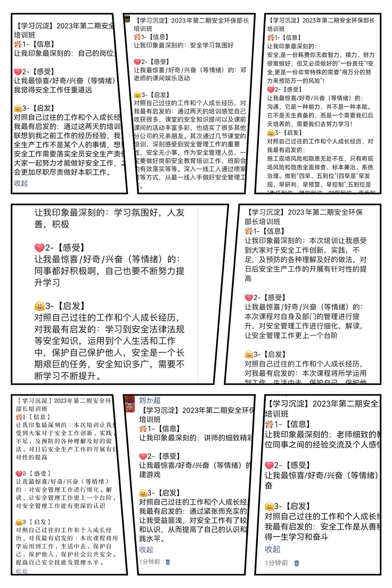 本次培训班课程全部由公司内部培训师讲授,课程设置方面注重结合公司生产实际案例进行分析解读,包括安全生产法律法规、施工安全事故案例、创新安全管理、建筑施工环境管理、安全生产标准化及安全文化建设以及纪检专题培训和情绪压力管理等。