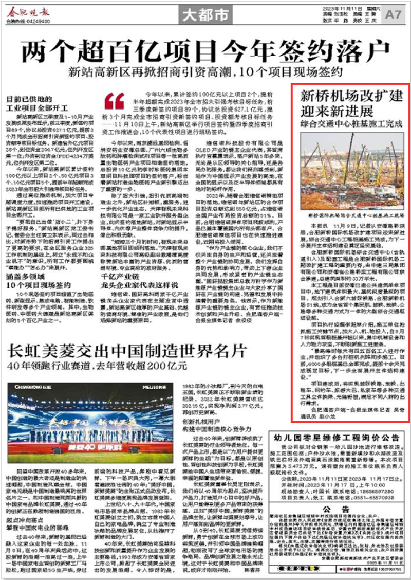 近日,公司承建的合肥新桥国际机场改扩建项目迎来新进展,综合交通中心工程桩基施工完成,为下一步展开主体结构建设奠定坚实基础。央视网、中新网、中国建设报、安徽交通广播、合肥日报、合肥新闻等多家中央和省市级主流媒体持续关注报道。