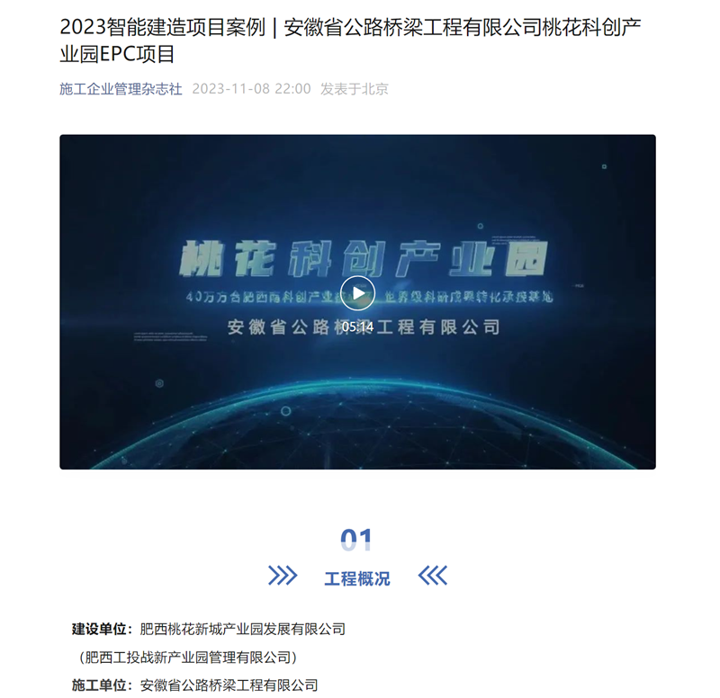 近日,从施工企业管理杂志社传来喜讯,桃花科创产业园项目入选施工企业管理杂志社2023智能建造项目案例,同步对案例进行了专题介绍。