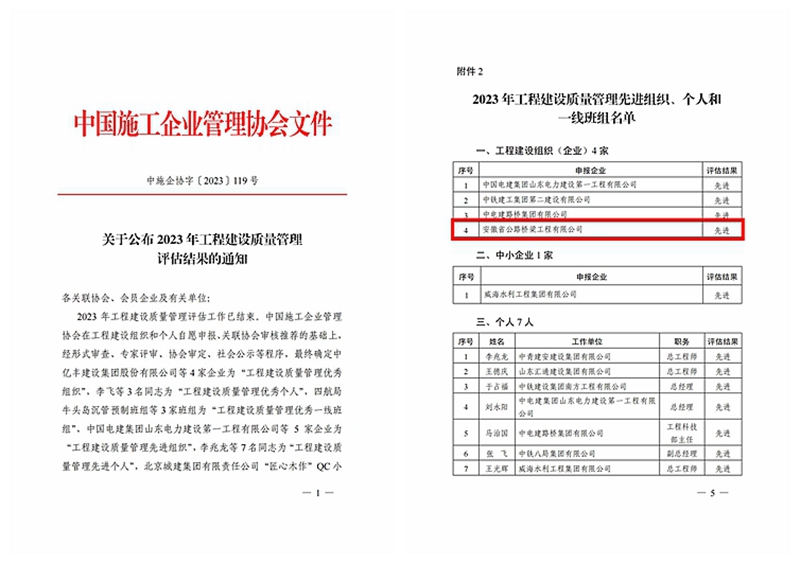近日,中国施工企业管理协会公布了“2023年工程建设质量管理”评估结果,公司在与众多央企竞争角逐下脱颖而出,入选“2023年工程建设质量管理先进组织”,是安徽省内唯一一家入选企业。
