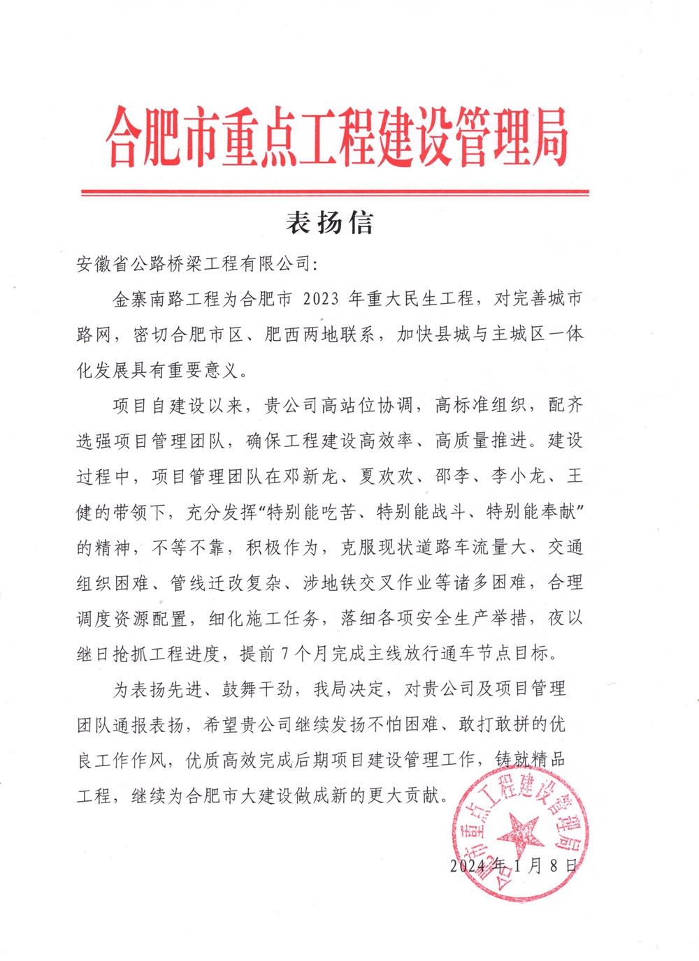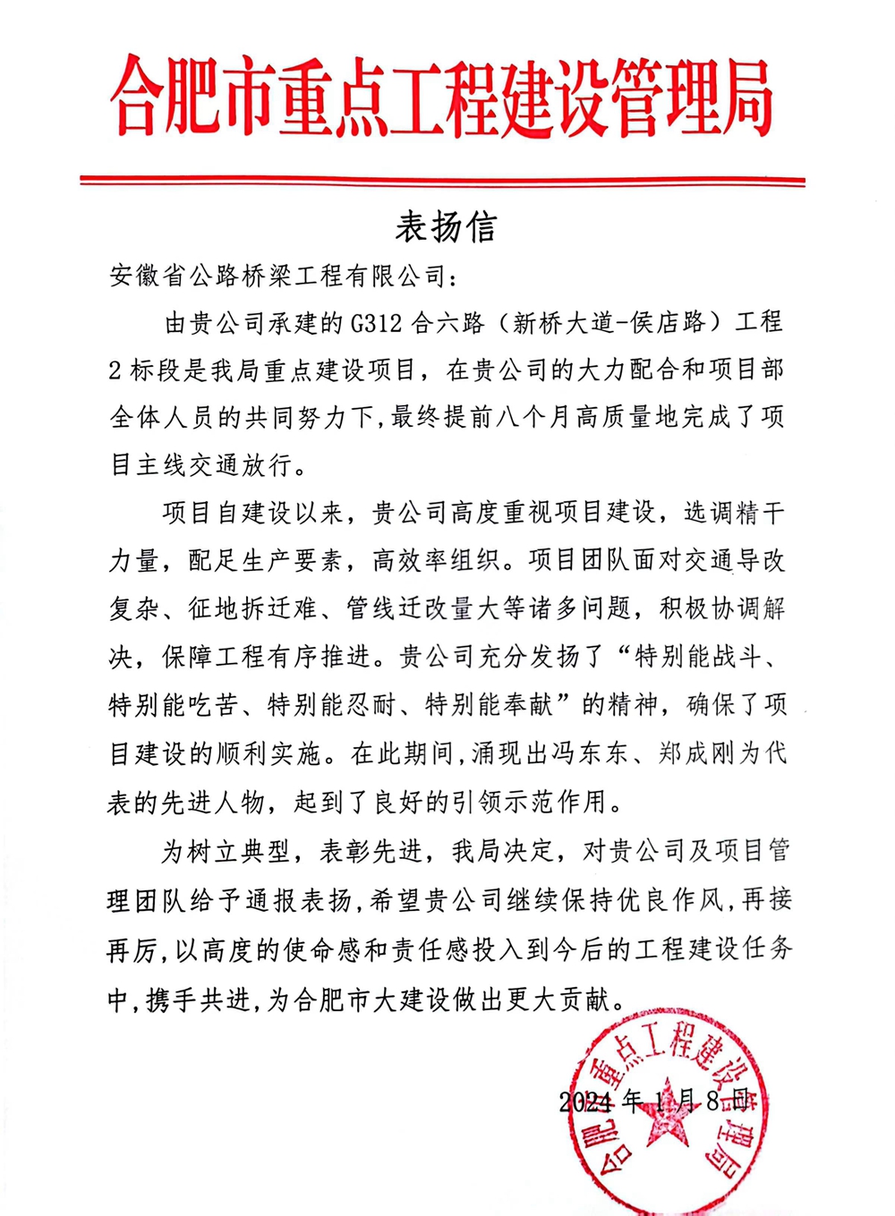 【载誉再出发】公司多个市政重点项目荣获表彰(三) 发布时间:2024年01月09日 来源:市政分公司 发布人:党委工作部 作者:周健 浏览:2809次 近日,公司承建的G312合六路(新桥大道-侯店路)工程2标、金寨南路快速化改造(望水路-站前路)项目、金寨南路快速化改造工程(站前路—深圳路)1标项目收到合肥市重点局来信表扬。 来信指出,G312合六路(新桥大道-侯店路)工程2标等3个项目在建设过程中,高站位协调,高标准组织,配齐选强项目管理团队,确保工程建设高效率、高质量推进,圆满完成了主线通车任务。同时对项目建设过程中涌现出的冯东东、邓新龙、夏欢欢、郑成刚、邵李、李小龙、王健等先进人物进行了表扬。