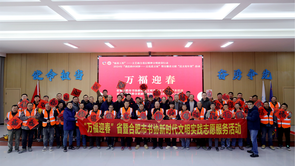 在活动现场,十余位安徽省书法名家挥毫泼墨,历时一个半小时创作了百余幅寓意美好的春联和一张张喜气洋洋的“福”字,将饱含真情实意的美好祝福融于其中,也让建设者们提前感受到了浓浓年味。