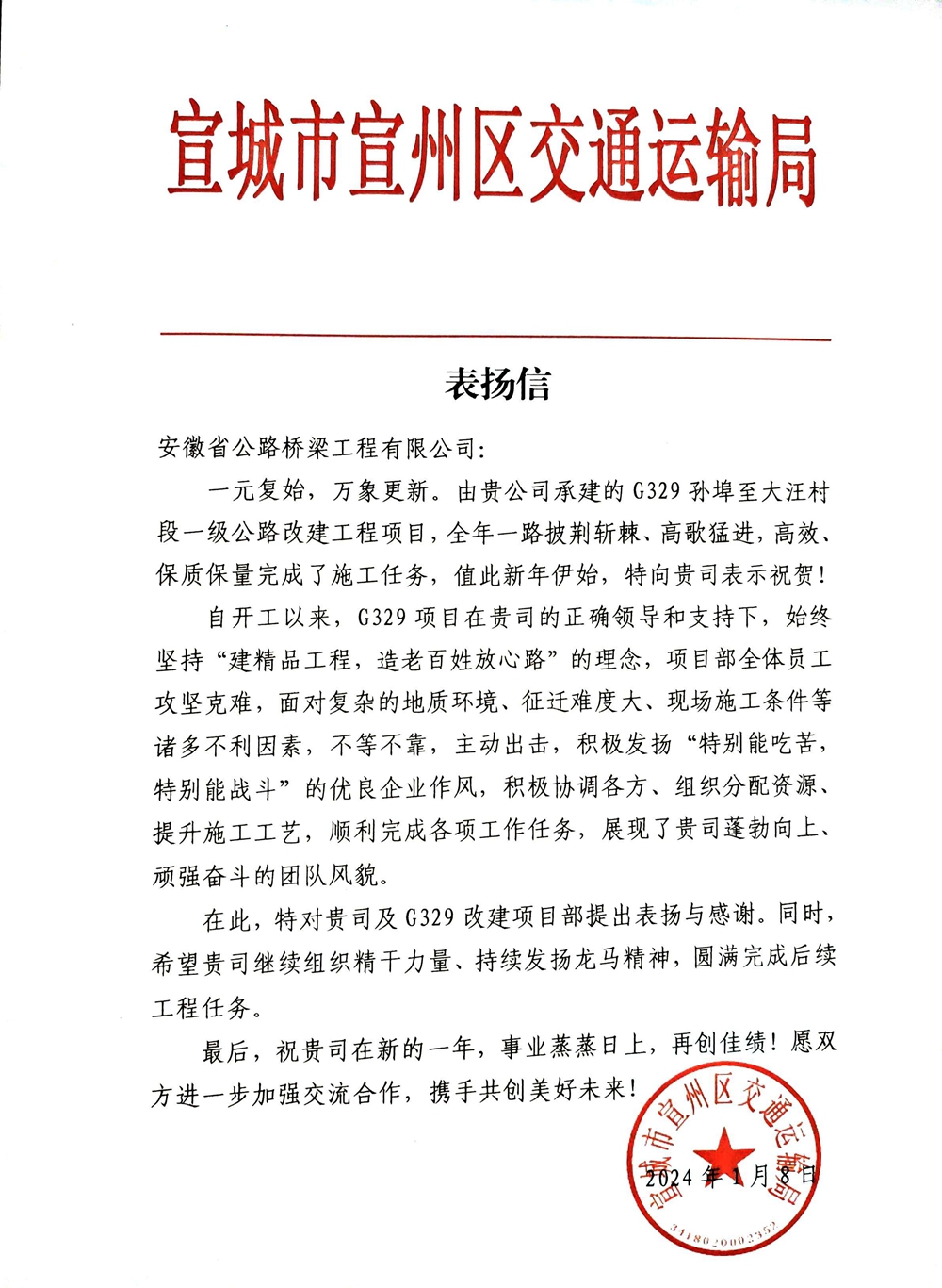 宣城市宣州区交通运输局来信指出,G329孙埠至大汪村段一级公路改建工程项目始终坚持“建精品工程,造百姓放心路”的理念,克服地质环境复杂、征迁难度大、施工条件差等诸多不利因素,积极协调各方,顺利完成各项工作任务,展现了项目团队顽强奋斗的精神风貌。