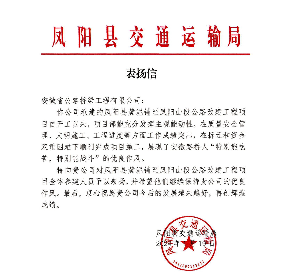 凤阳县交通运输局来信表示,凤台县黄凤公路改建工程项目团队发挥主观能动性,在质量安全管理、文明施工、工程进度等方面工作成绩突出,充分发扬了安徽路桥“特别能吃苦、特别能战斗”的企业作风。