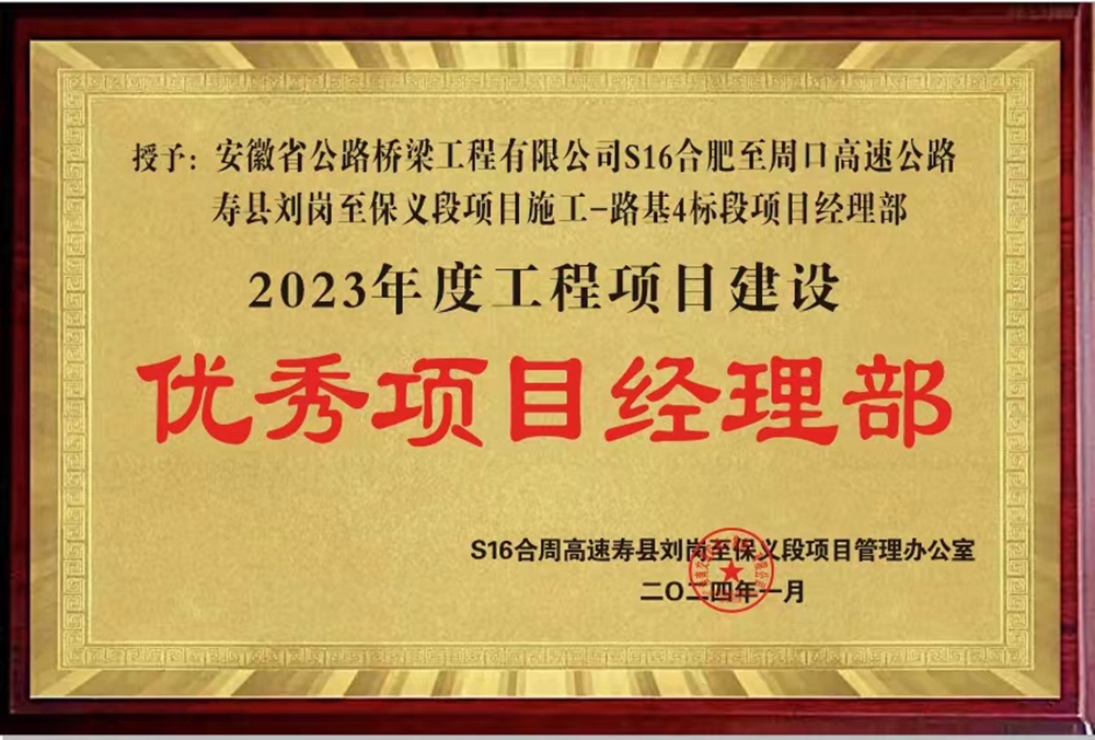 淮南交控(集团)有限公司S16合周高速寿县刘岗至保义段项目办发布2023年度“五比五看”评比得分通报,公司承建的S16合周高速4标东淝河大桥项目在全线脱颖而出,位列年度综合考评第一名,获通报表扬,并被授予“优秀项目经理部”荣誉称号。