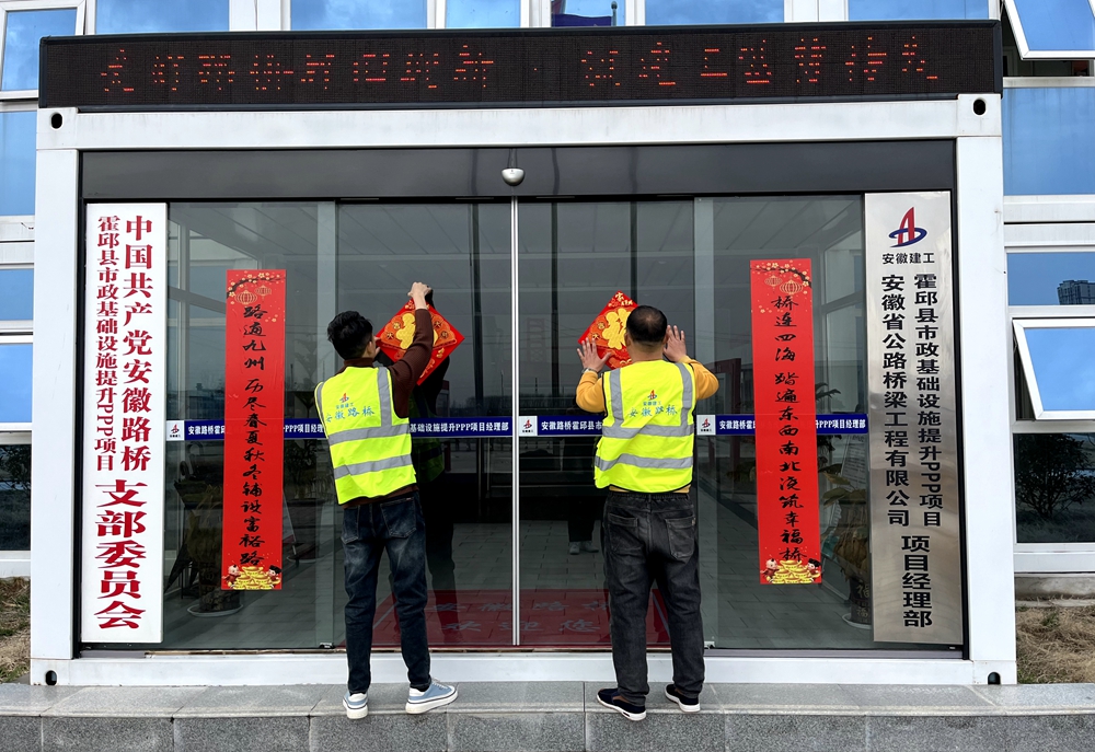 春节期间,霍邱县市政基础设施提升PPP项目值守人员与工友为项目门窗贴上春联、福字,大家一起准备了年夜饭,共度佳节,感受别样的家的温暖。