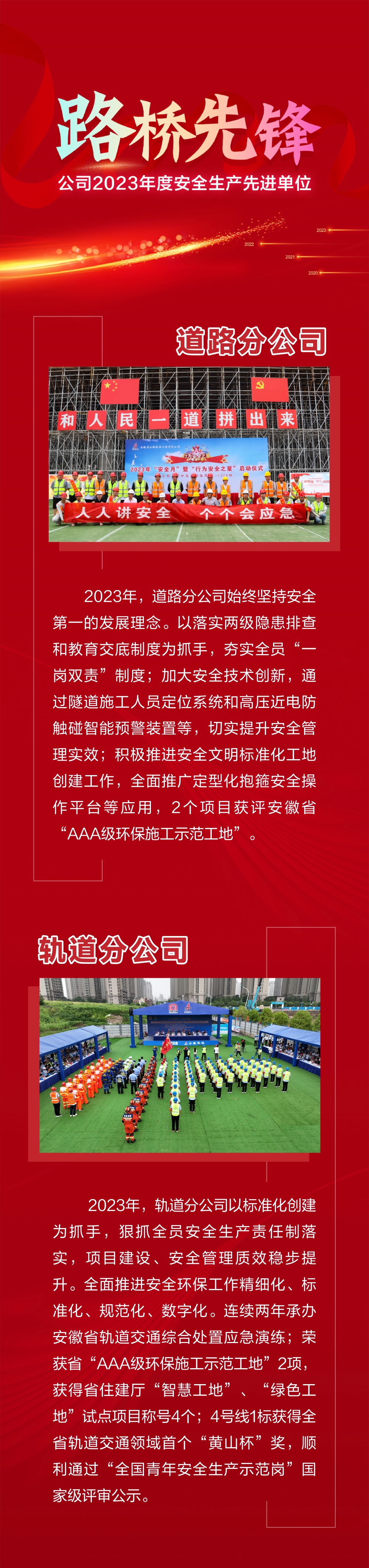 【路桥先锋】公司2023年度安全生产先进单位风采展示 发布时间:2024年03月16日 来源:党委组织部(人力资源部、党委宣传部)、所属各单位 发布人:党委组织部(人力资源部、党委宣传部) 作者: 浏览:2510次