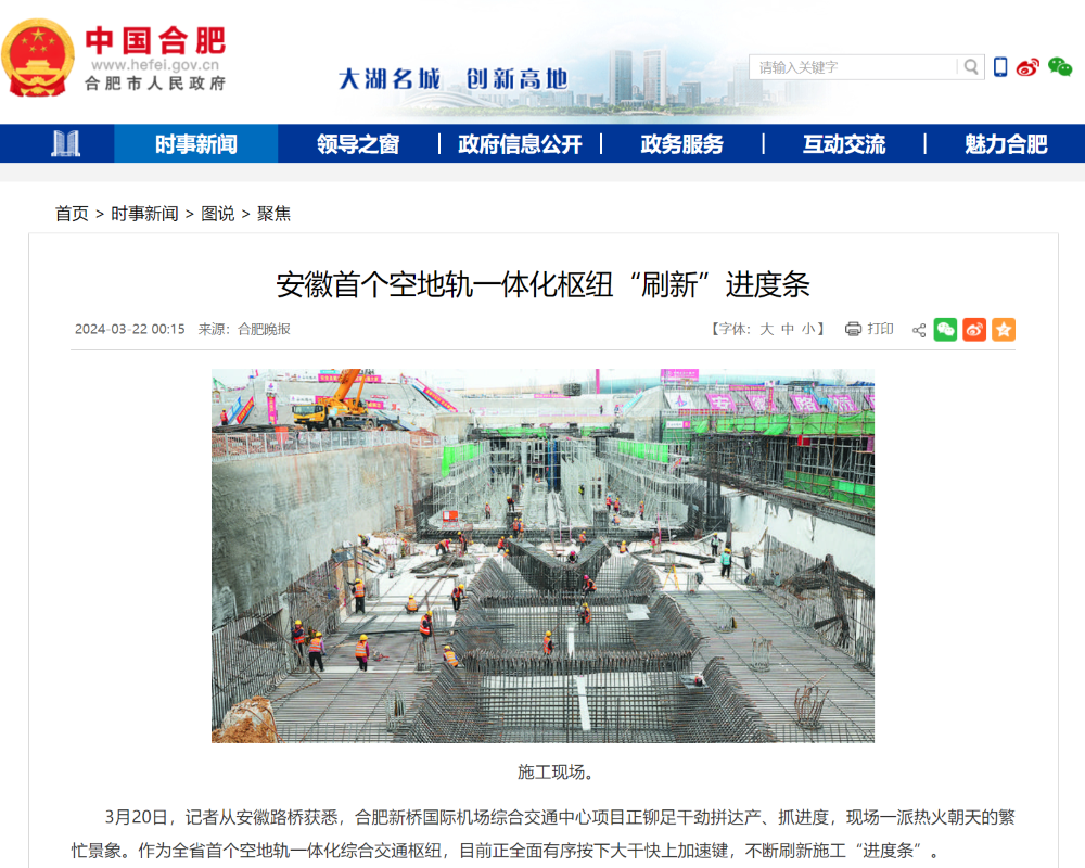 合肥新桥国际机场综合交通中心项目作为全省首个空地轨一体化综合交通枢纽,年后复工复产以来,铆足干劲拼达产、抓进度,持续掀起大干热潮。目前项目正全面有序推动工程建设,不断刷新施工“进度条”,受到合肥新闻联播、合肥晚报、合肥市人民政府官网、合肥在线等多家主流媒体的关注报道。