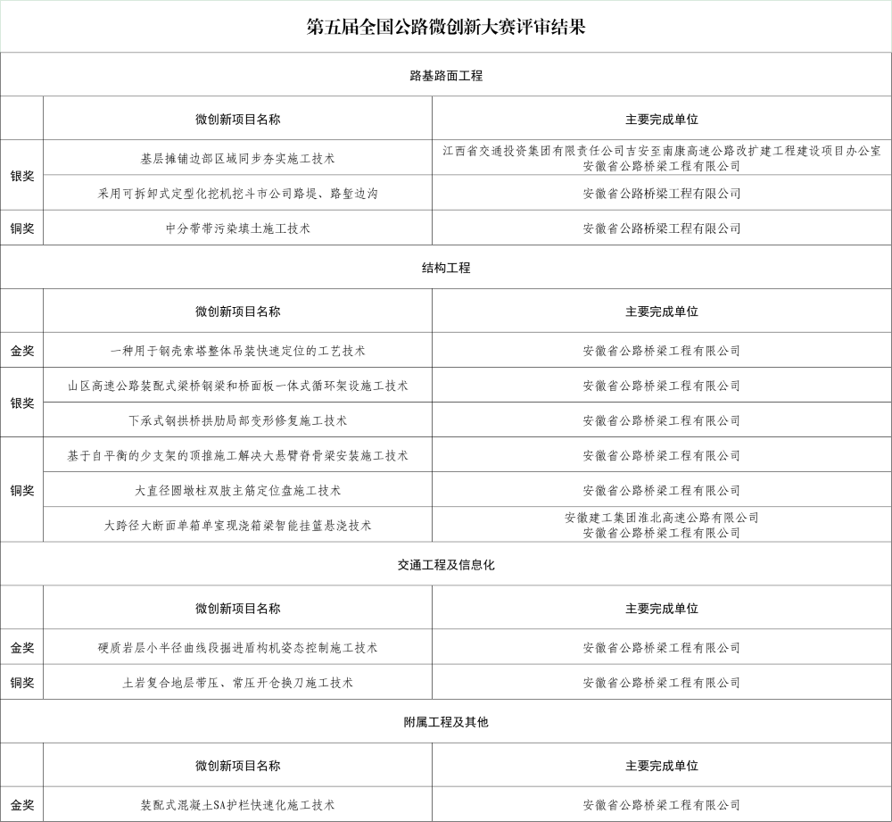 近日,中国公路学会公布了第五届全国公路微创新大赛评审结果,公司《一种用于钢壳索塔整体吊装快速定位的工艺技术》《采用可拆卸式定型化挖机挖斗施工路堤、路堑边沟》《中分带无污染填土施工技术》等十余项微创新成果在众多参赛项目中脱颖而出,分别荣获金奖、银奖、铜奖。