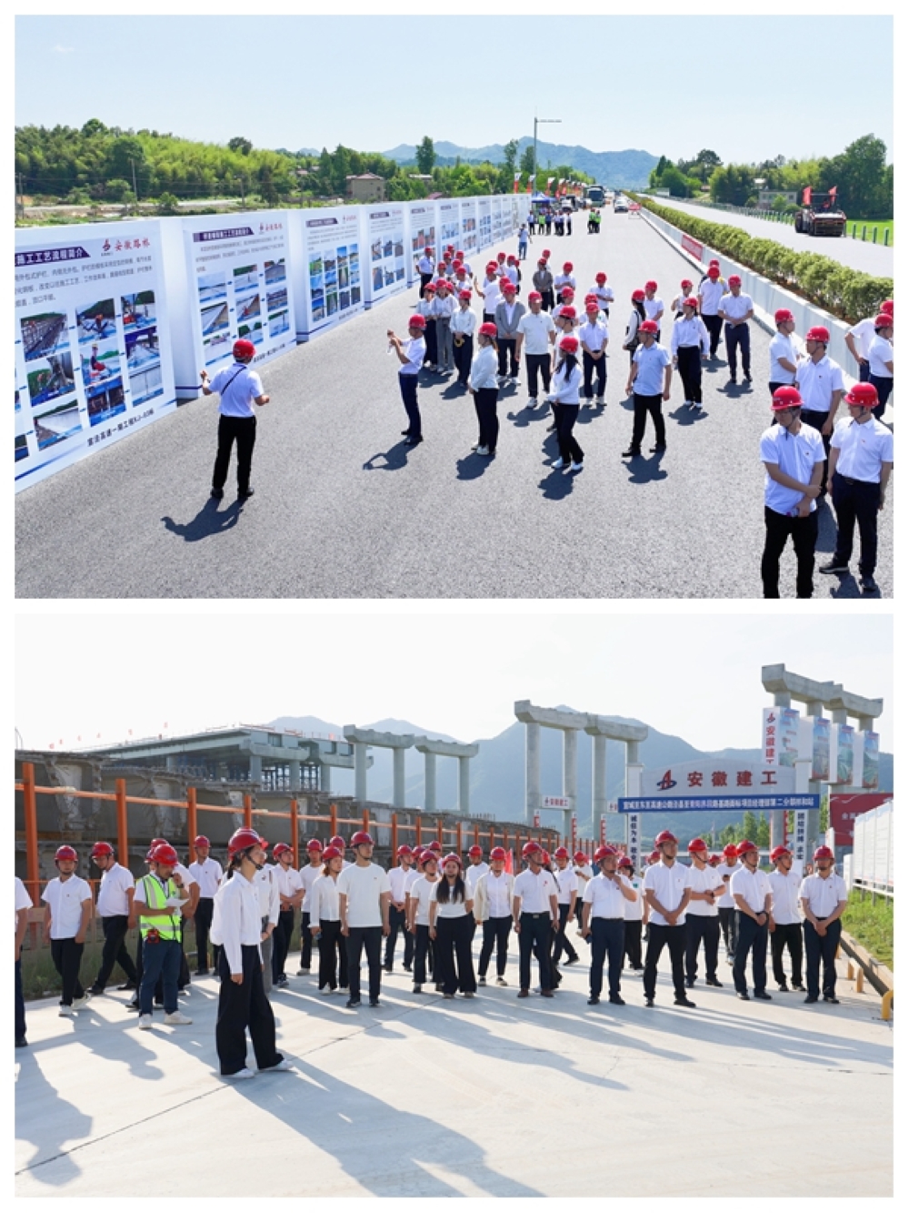 在安徽路桥宣泾高速一期03标项目,青年们参观了项目驻地及党群活动场所,在施工现场观摩了解了沥青无人摊压技术和新泽西护栏预制安装等施工工艺。在安徽水利泾青高速二分部,青年们先后参观了青弋江特大桥安全文明施工以及场站和安全体验馆标准化建设情况。