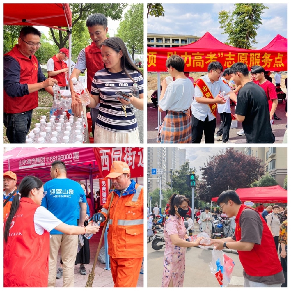 在考点外,志愿者们设立了“爱心助考站”,将助考遮阳棚变成“能量站”,为考生及家长搭建遮阳避雨的休息区,提供应急药品、防暑降温用品、文具补给等贴心服务。随时为莘莘学子、陪考家长、工作人员和民警同志“加油”“打气”。