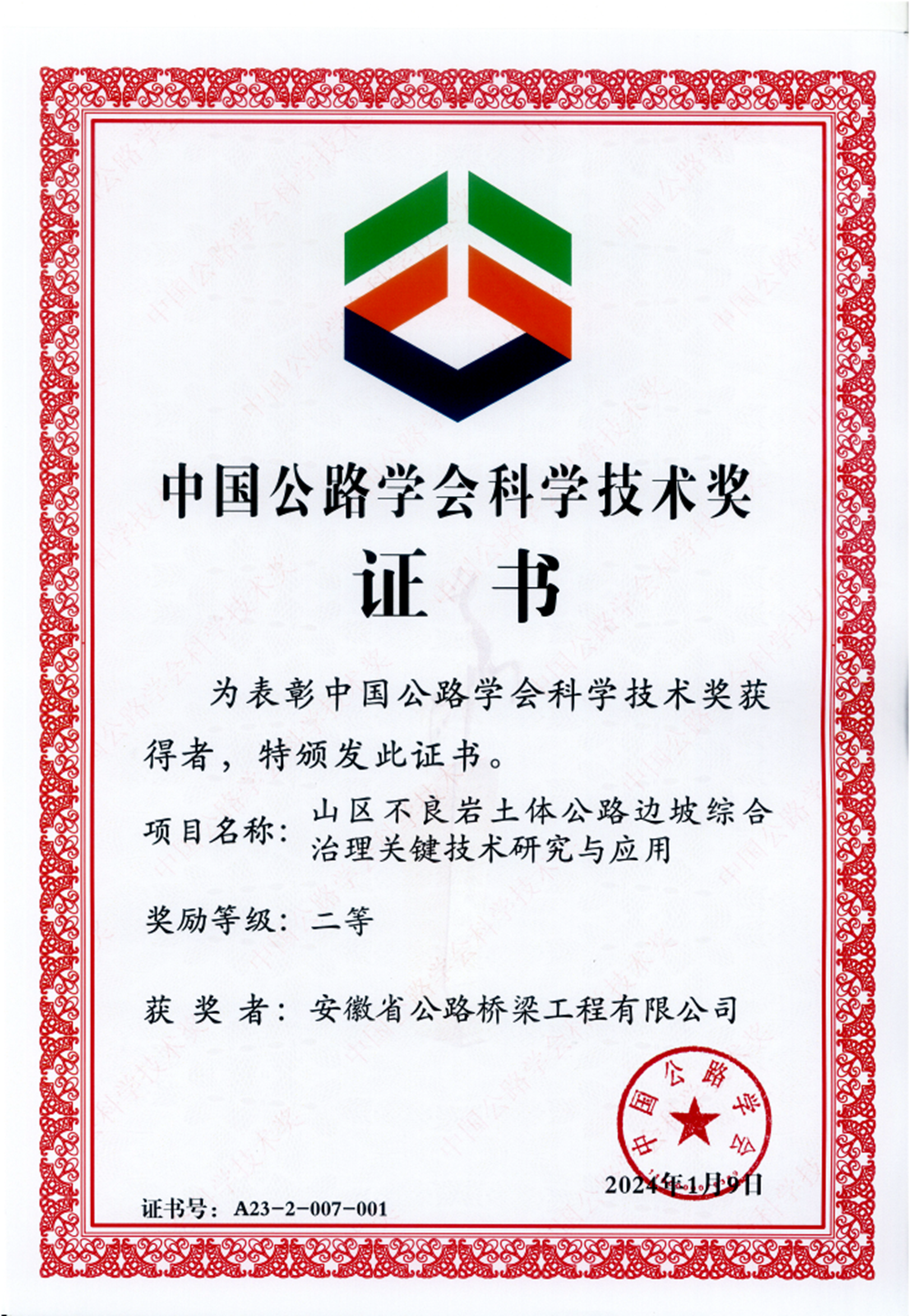 公司荣获2023年度中国公路学会科学技术二等奖