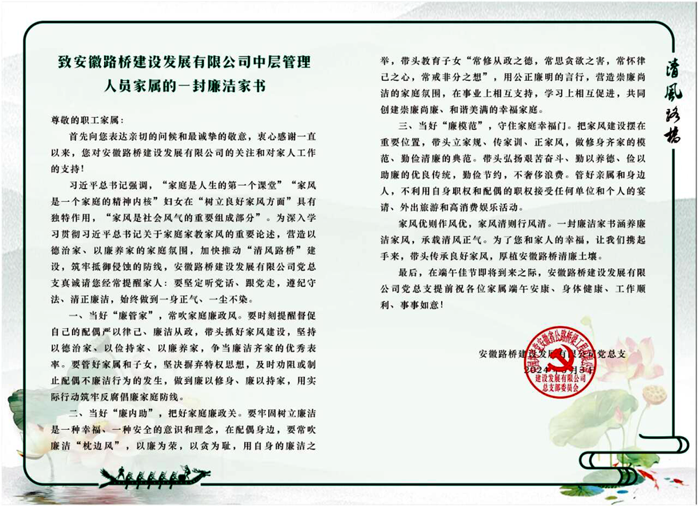 建设公司深入贯彻落实集团纪委阳光、清廉、建工“六个一”廉洁文化创建工作部署,积极推进“清廉”之家建设。组织开展“5·10思廉日”活动,为50余名管理人员发放廉洁家书,进一步加强家风家教建设,将家庭亲情融入职工廉洁教育中;组织参与公司纪委读书月读廉书活动,择优推荐3幅读廉书作品。组织职工积极参加公司信息化“廉洁知识测试”活动,促进党员干部职工以考促学、以学促廉。