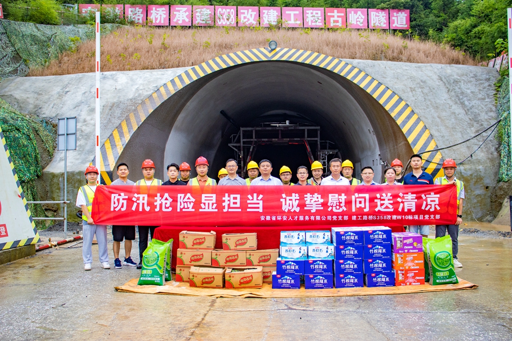 7月14日下午,共青团池州市委副书记、市青联主席蒋业健带队到公司承建的S358改建W10标古岭隧道施工现场,开展“防汛抢险显担当 诚挚慰问送清凉”活动,看望慰问奋战在施工一线的建设者们,叮嘱要科学安排施工和休息时间,并送来防暑降温物资。