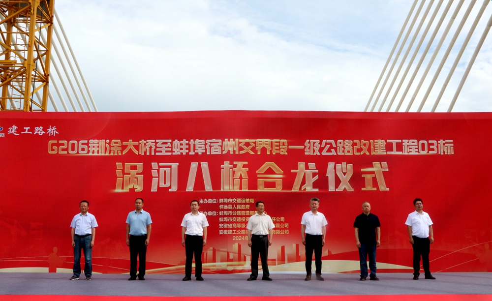 7月20日上午,G206-03标涡河八桥主桥顺利合龙。蚌埠市副市长张铭出席合龙仪式并宣布大桥正式合龙,蚌埠市政府副秘书长张圣辉主持合龙仪式,蚌埠市交通运输局党委书记、局长戴勇,怀远县副县长赵树建,公司党委书记、董事长钱申春出席合龙仪式并分别致辞。