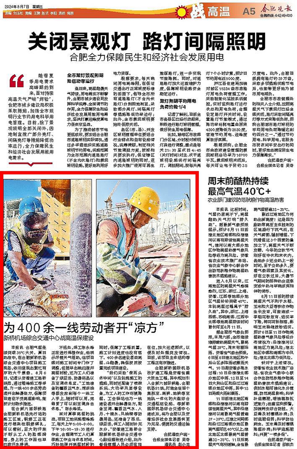 近日合肥气温连续突破35℃大关。安徽新闻联播、安徽日报、合肥晚报等多家省市主流媒体深入报道安徽建工路桥合肥新桥国际机场综合交通中心项目战高温、保生产。项目开出解暑良方,采取错时施工、在作业区增设工业风扇等措施,保障高温天气下劳动者生命安全和身体健康,确保这一重点工程建设的生产进度,保障项目建设不受高温影响稳步推进。