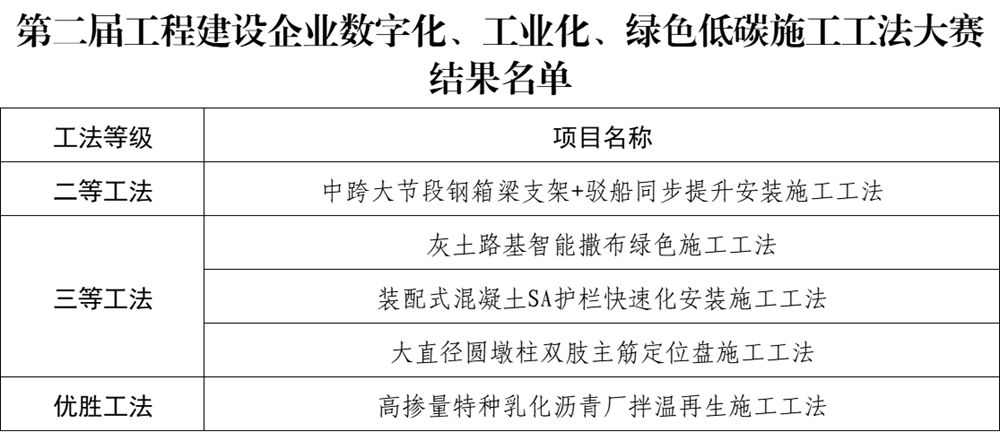 近日,中国施工企业管理协会公布了第二届工程建设企业数字化、工业化、绿色低碳施工工法大赛结果,公司《中跨大节段钢箱梁支架+驳船同步提升安装施工工法》《灰土路基智能撒布绿色施工工法》等五项工法在众多参赛工法中脱颖而出,分别获得二等工法1项、三等工法3项、优胜工法1项。