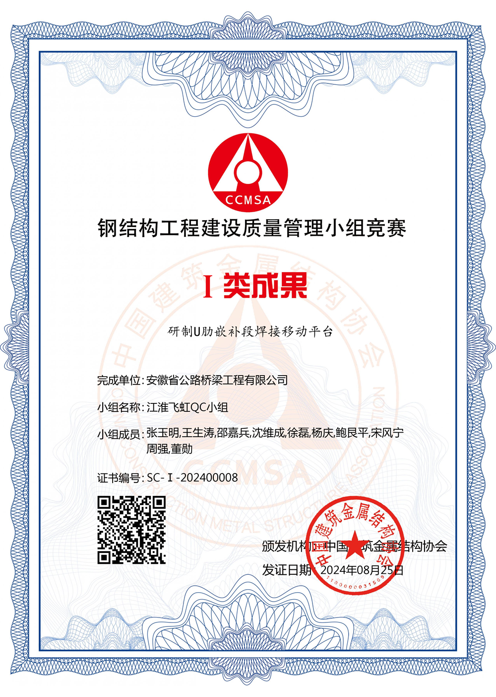 喜讯!公司荣获全国性质量管理小组竞赛Ⅰ类成果 发布时间:2024年08月27日 来源:技术质量部、市政分公司 发布人:党委组织部(人力资源部、党委宣传部) 作者:徐磊、宋风宁 浏览:2250次 8月23日至25日,中国建筑金属结构协会在大同举办2024年钢结构工程建设质量管理小组竞赛,公司《研制U肋嵌补段焊接移动平台》QC成果受到评审专家的一致好评,荣获Ⅰ类成果,同时作为优秀成果案例在表彰大会上作交流。