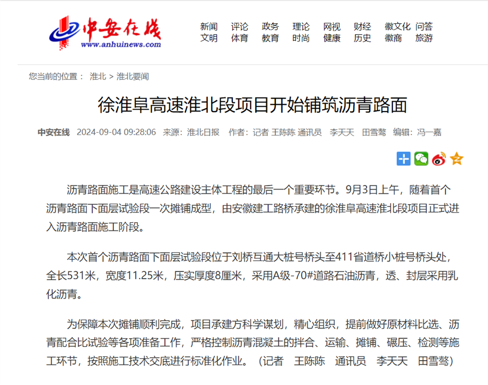沥青路面施工是高速公路建设主体工程的最后一个重要环节。9月3日上午,随着首个沥青路面下面层试验段一次摊铺成型,由安徽建工路桥承建的徐淮阜高速淮北段项目正式进入沥青路面施工阶段。