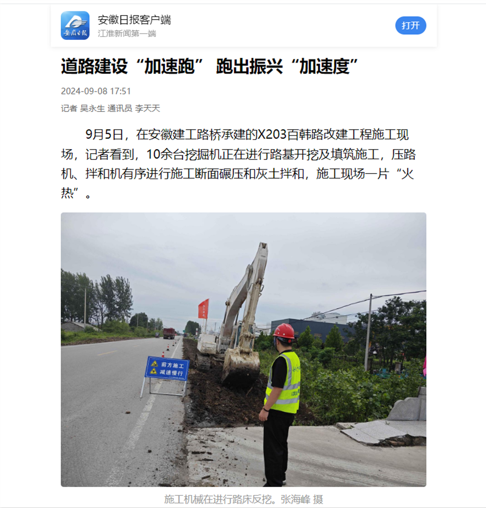 【名媒聚焦】安徽日报客户端:X203百韩路改建工程——道路建设“加速跑” 跑出振兴“加速度”