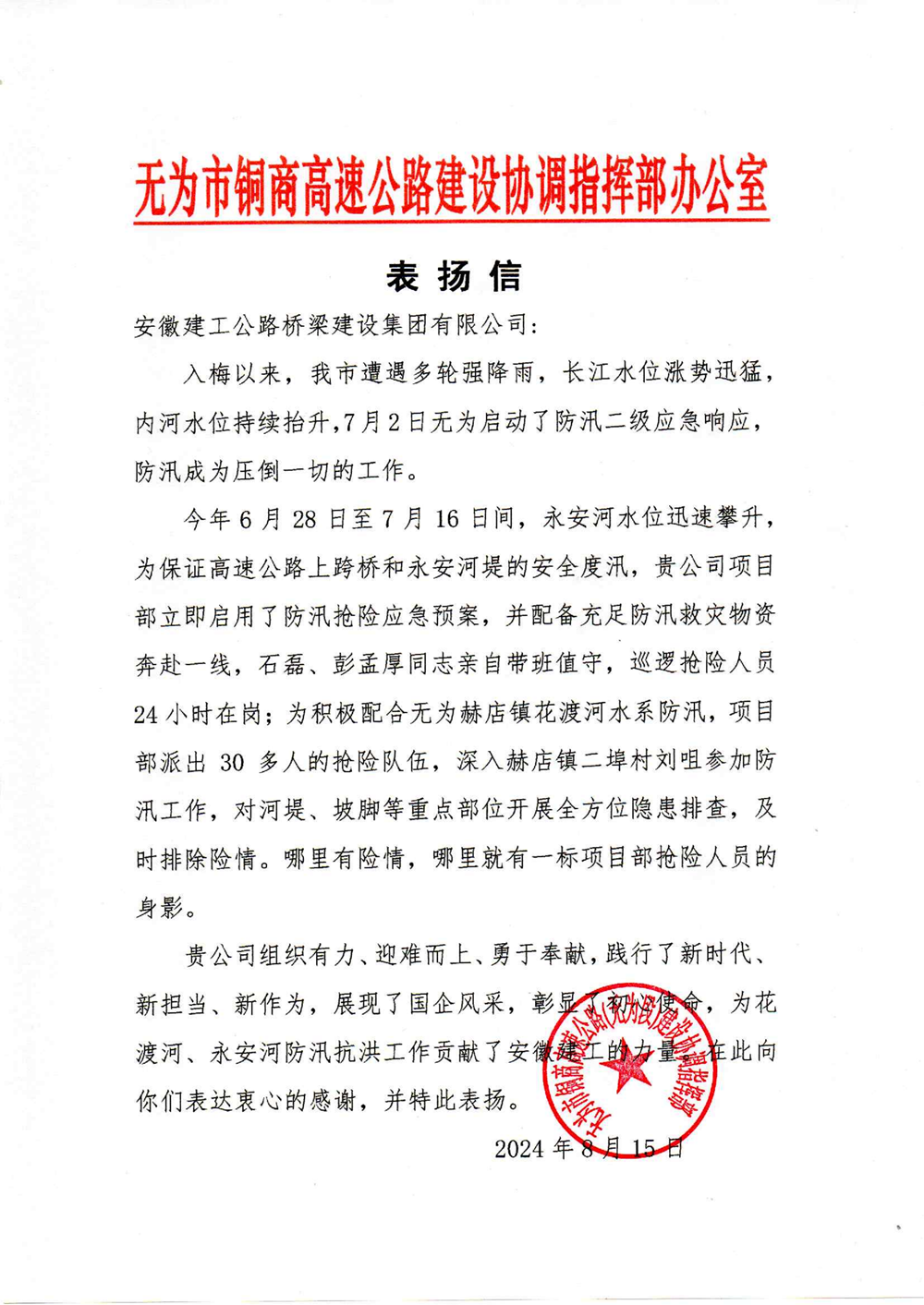 无为市铜商高速公路(无为段)建设协调指挥部对公司承建的铜商高速主体1标项目部进行表扬。来信指出,汛期期间,项目部及时启动防汛抢险应急预案,配足物资奔赴一线,迎难而上,安排人员24小时巡逻,开展全方位隐患排查,为防汛抗洪工作作出了突出贡献,展现了国企担当。