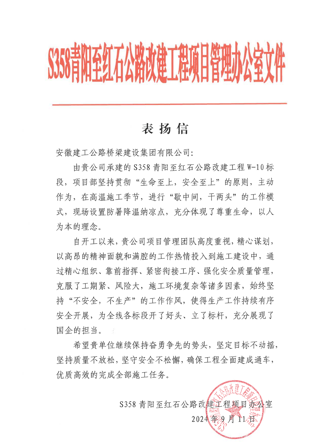 S358青阳至红石公路改建工程项目办公室来信指出,公司承建的W10标在高温施工季节,坚持贯彻“生命至上,安全至上”的原则、“不安全,不生产”的工作作风,落实防暑降温措施和安全生产各项要求,体现了“以人为本”的理念。