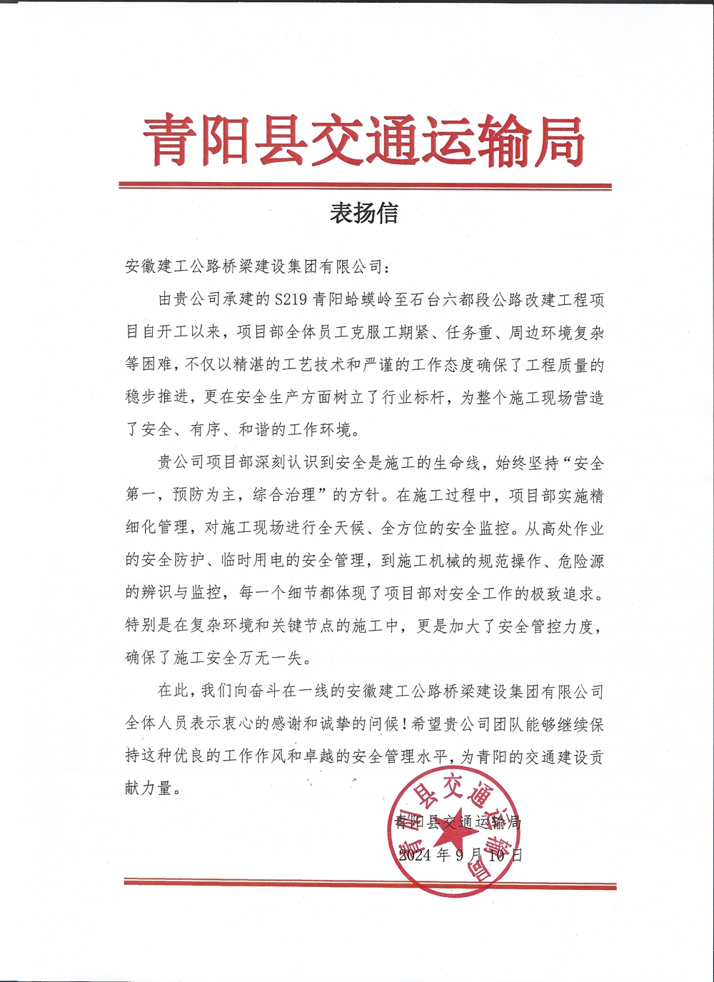青阳县交通运输局来信表示,青阳S219改建项目自开工以来,不断克服工期紧、任务重、周边环境复杂等困难,始终坚持“安全第一,预防为主,综合治理”的方针,安全稳步推动项目建设,在安全生产方面树立了标杆。