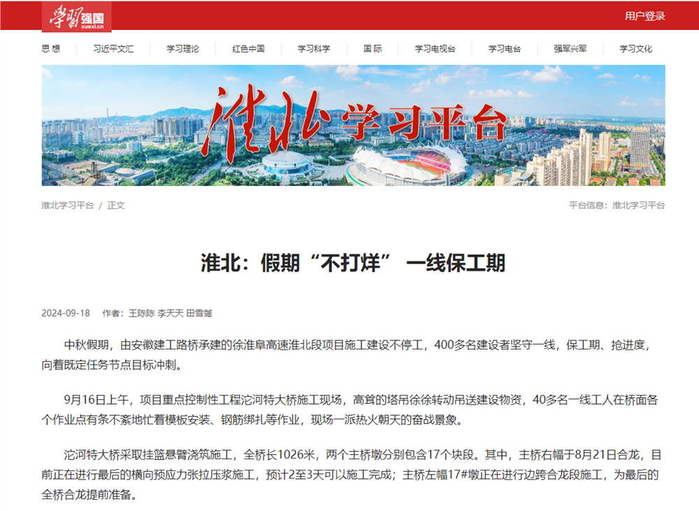 【名媒聚焦】多家主流媒体聚焦报道建工路桥项目建设 发布时间:2024年09月19日 来源:所属各单位 发布人:党委组织部(人力资源部、党委宣传部) 作者: 浏览:3503次 中秋假期,安徽建工路桥建设者坚守岗位一线,抢抓施工“黄金期”,冲刺节点目标,跑出实干“加速度”,受到多家主流媒体聚焦报道。学习强国淮北新闻联播淮北日报合肥新闻联播合肥新闻联播