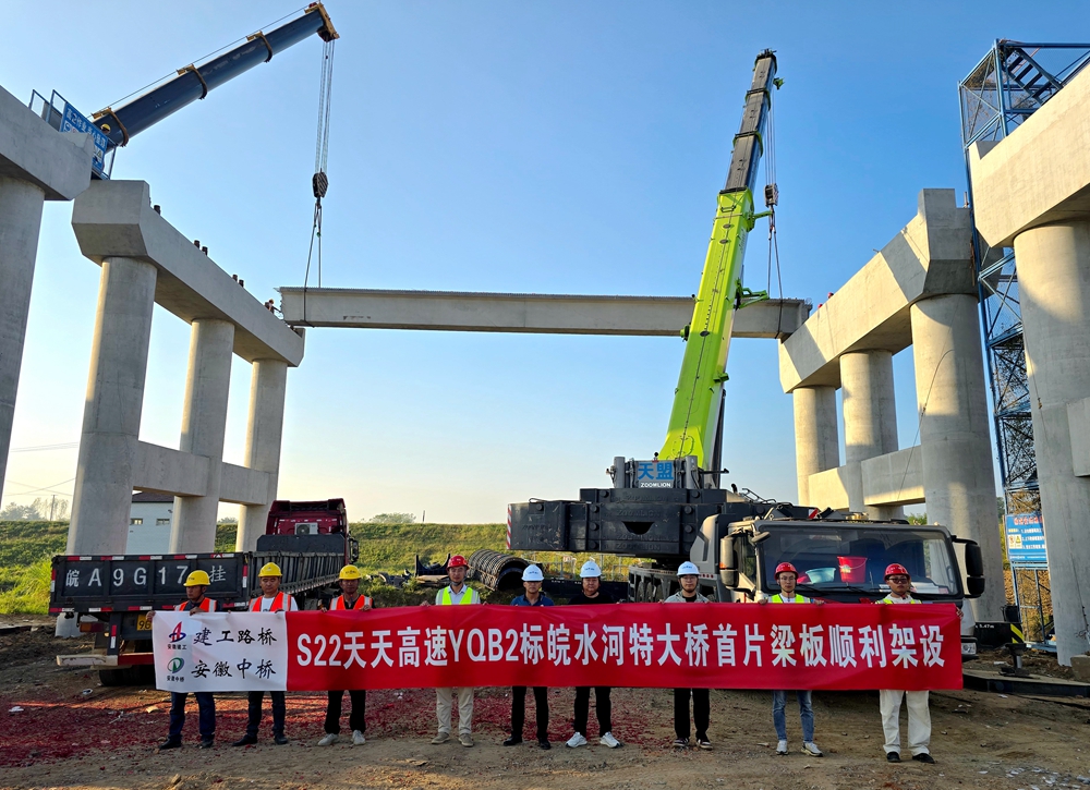 在S22天天高速YQB2标关键控制性工程——皖水河特大桥施工现场,项目部紧盯施工节点,压实责任抓落实,顺利完成首片预制箱梁架设。