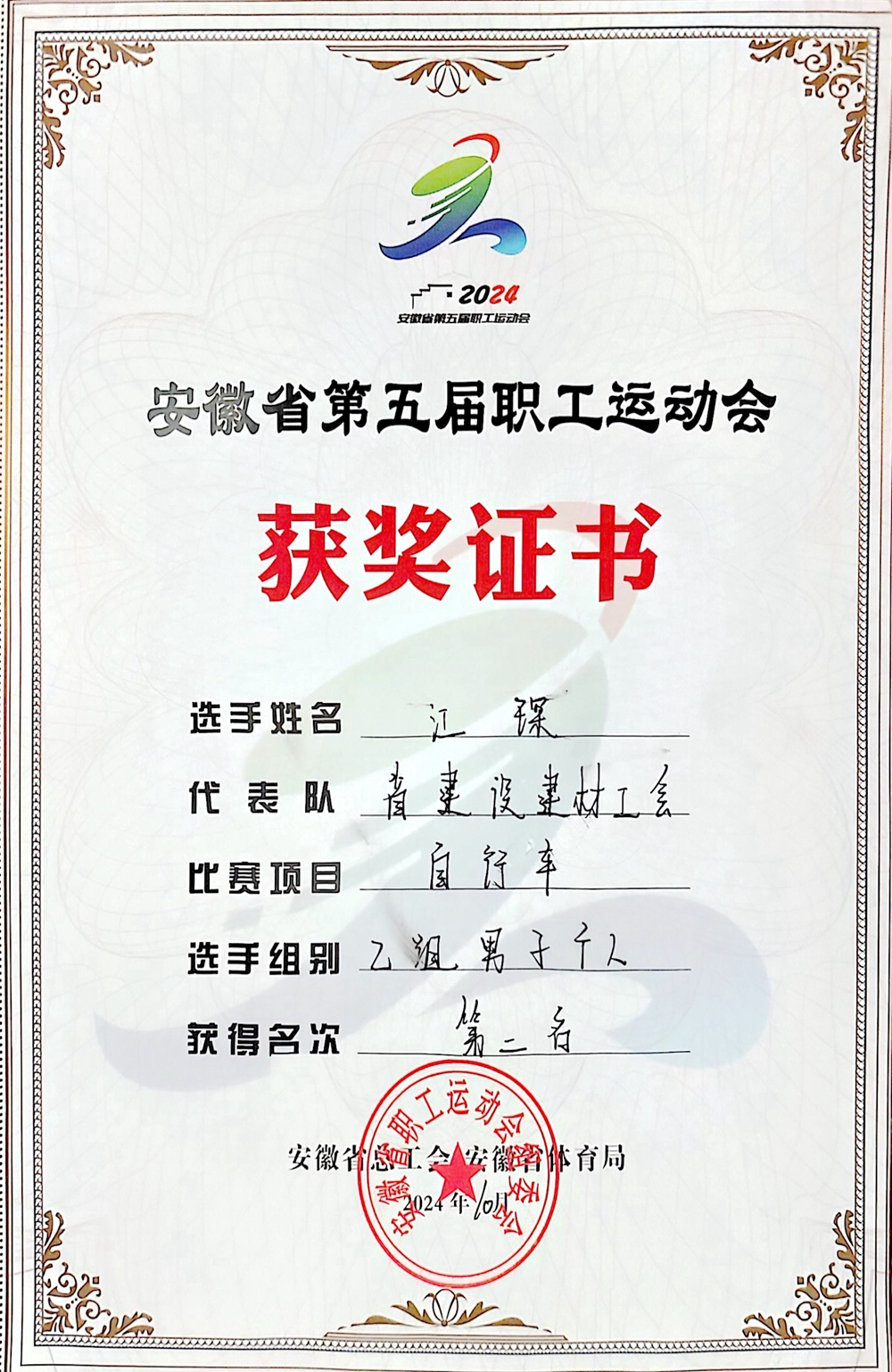 10月13日,由安徽省总工会、安徽省体育局联合举办的省第五届职工运动会自行车比赛在池州举行,公司选送的参赛选手江琛代表省建设建材工会参加角逐,经过激烈比拼,取得乙组自行车男子个人第二名的优异成绩。