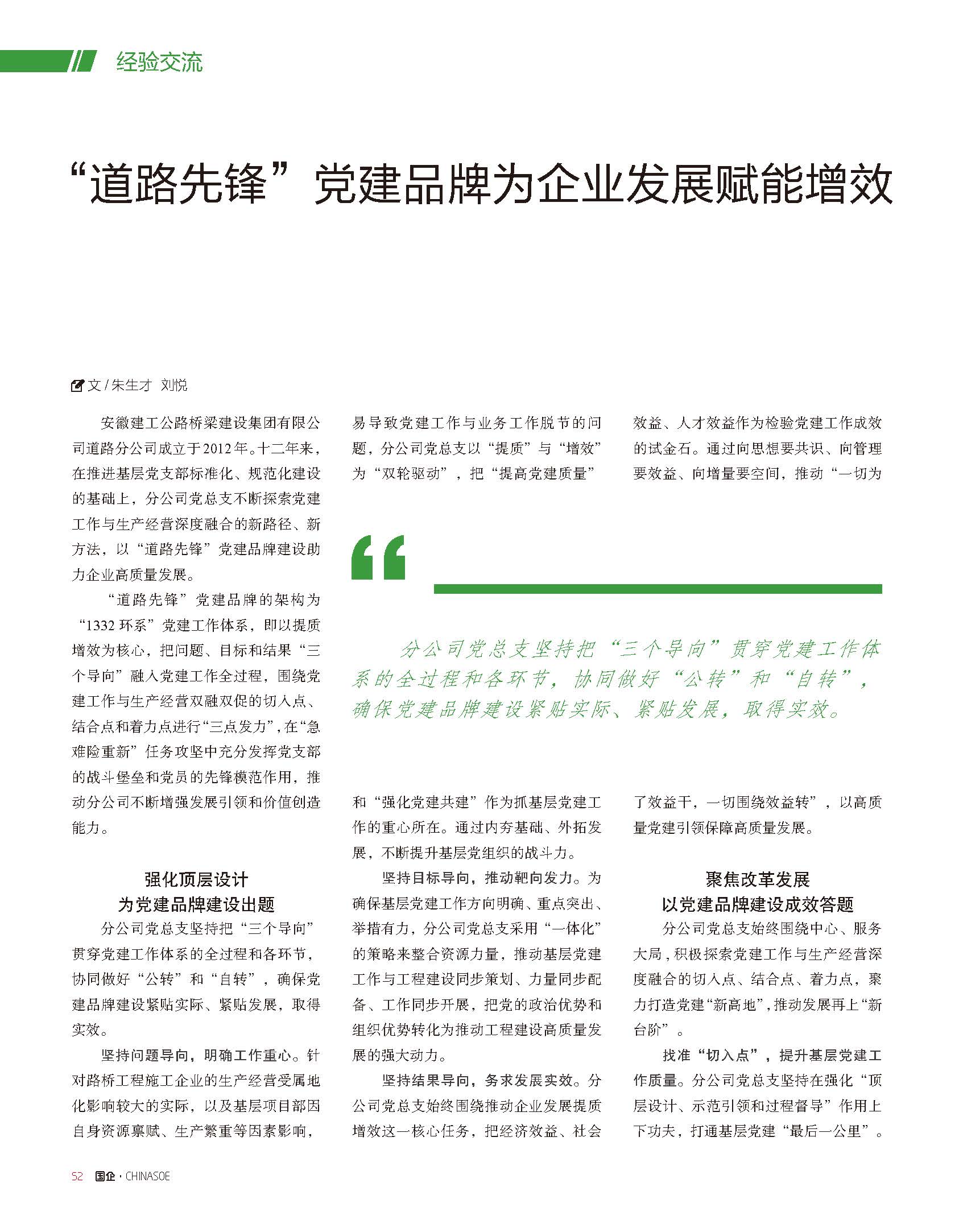 近日,《国企》杂志2024年10月第20期和《国企党建研究》微信公众号刊发文章《“道路先锋”党建品牌为企业发展赋能增效》,对安徽建工路桥道路分公司“道路先锋”党建品牌创建经验进行了报道。