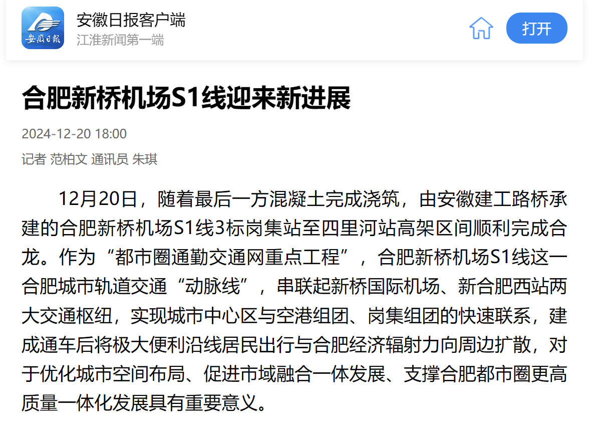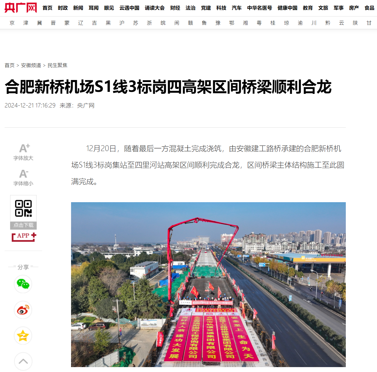 【名媒聚焦】央广网、安徽日报、中安在线等主流媒体聚焦报道合肥新桥机场S1线3标岗四高架区间桥梁合龙