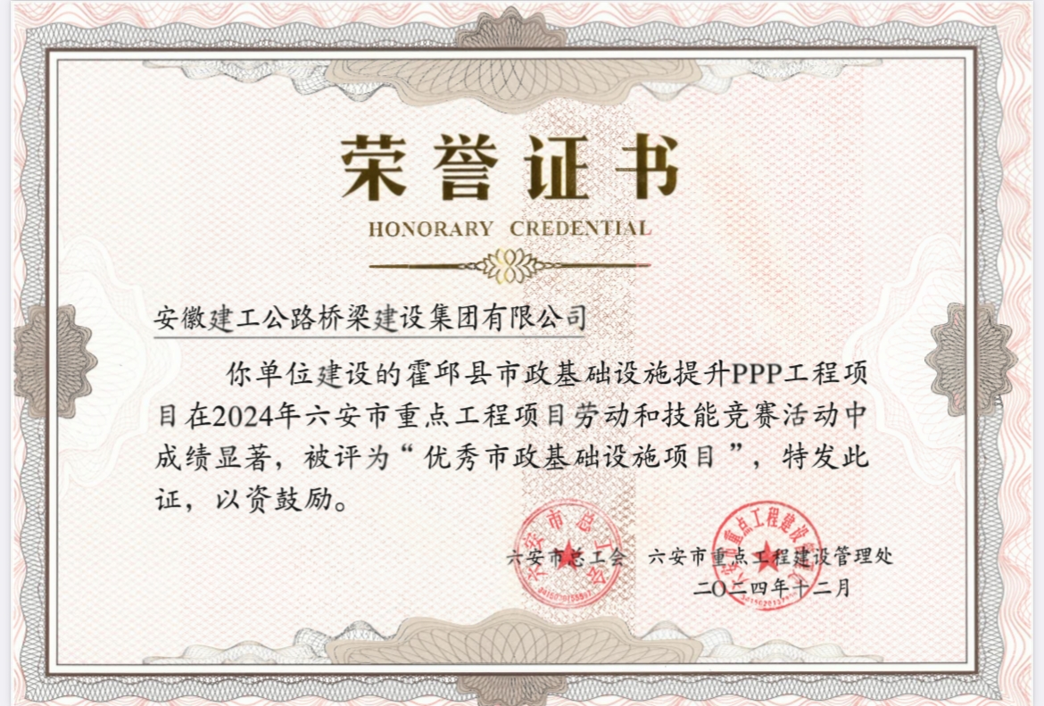 近日,“建功新时代 奋进新征程”2024年六安市重点工程项目劳动和技能竞赛成果公布,霍邱PPP项目荣获“优秀市政基础设施项目”荣誉称号。