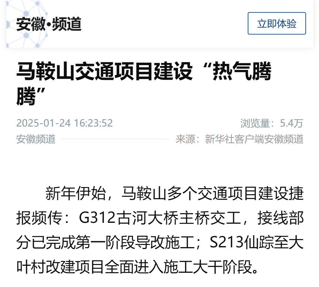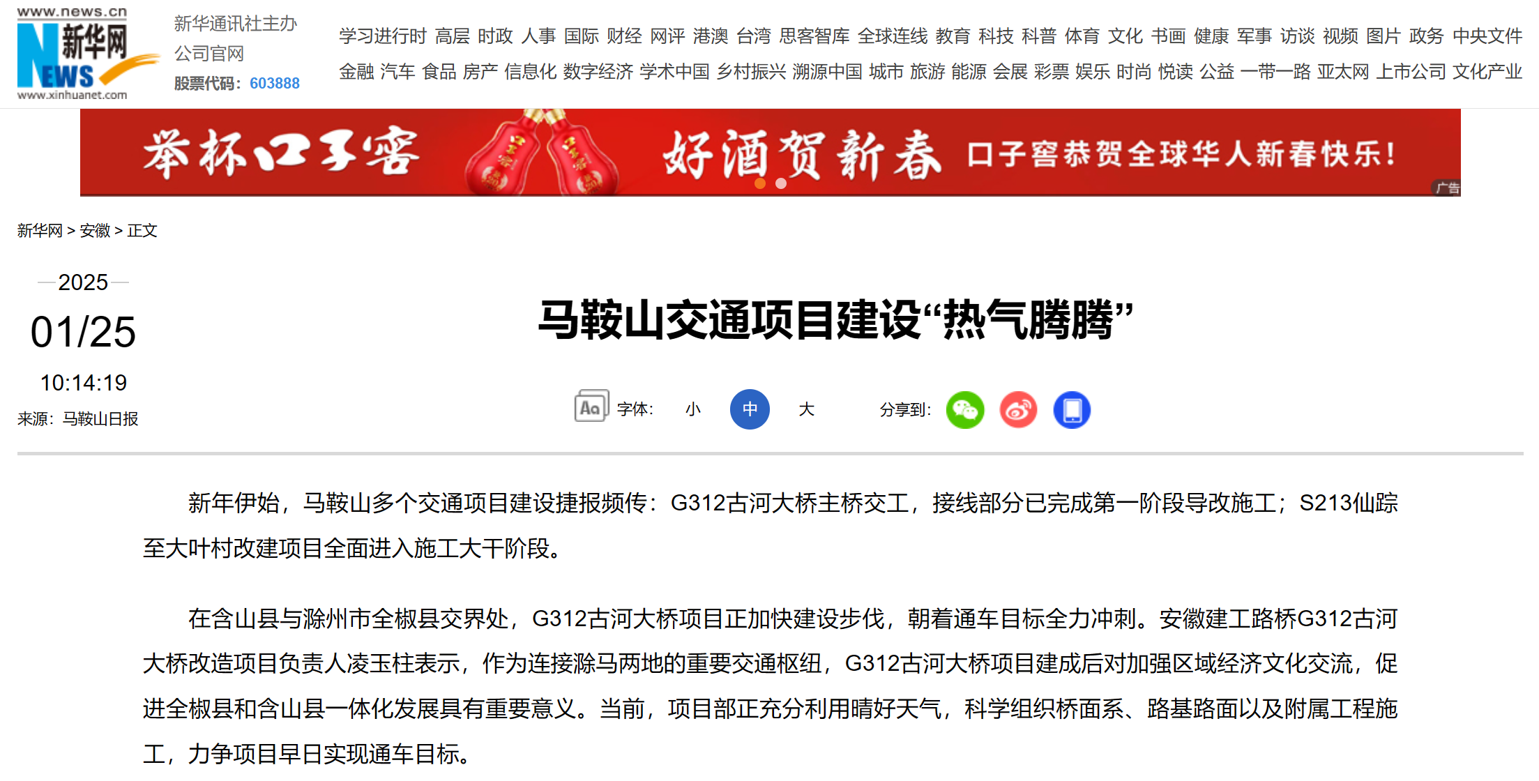 新年伊始,马鞍山多个交通项目建设捷报频传:G312古河大桥主桥交工,接线部分已完成第一阶段导改施工;S213仙踪至大叶村改建项目全面进入施工大干阶段。