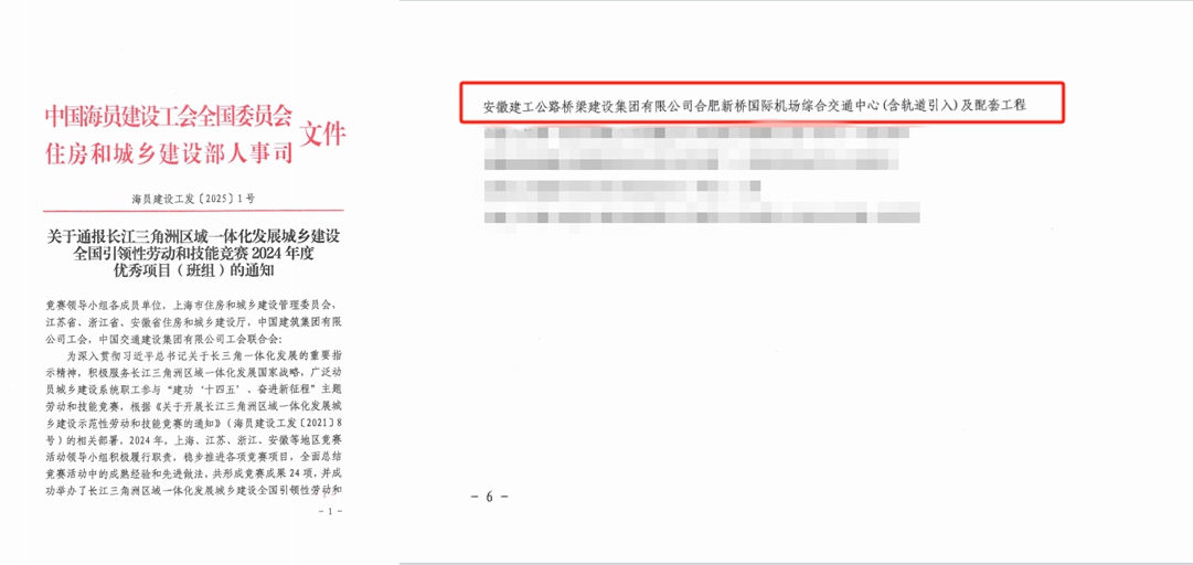 合肥新桥国际机场综合交通中心项目荣获长江三角洲区域一体化发展城乡建设全国引领性劳动和技能竞赛2024年度优秀项目