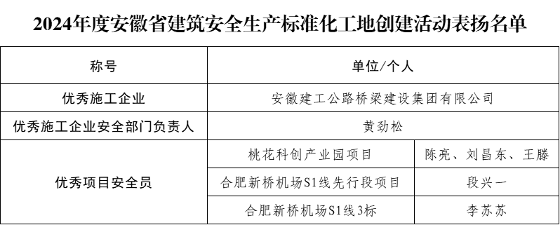 近日,安徽省建设工程与质量安全协会发布表扬通知,公司荣获“2024年度安徽省建筑安全生产标准化工地优秀施工企业”称号,公司安全环保部黄劲松同志荣获“2024年度安徽省建筑安全生产标准化工地优秀施工企业安全部门负责人”称号,桃花科创产业园项目、合肥新桥机场S1线先行段项目、S1线3标等3个项目安全管理人员荣获“优秀项目安全员”称号。