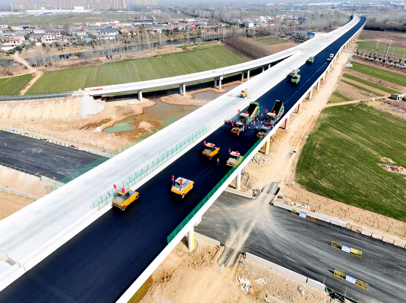 在宣城水阳江畔,G329孙埠至大汪村段一级公路改建工程围绕“边施工、边通车”,将全线划分为12个作业断面,加速推进水稳及沥青面层摊铺,力争4月底实现水东段左幅通车,全力冲刺八月通车目标。