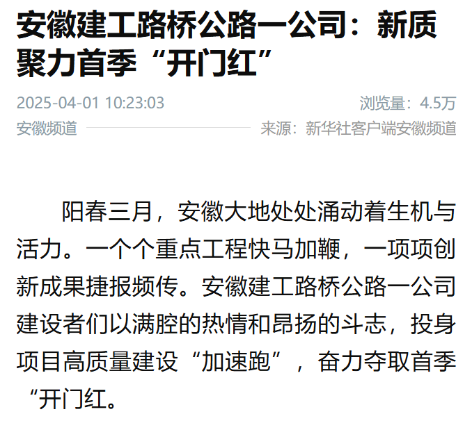 【央媒聚焦】新华社客户端:安徽建工路桥公路一公司——新质聚力首季“开门红”